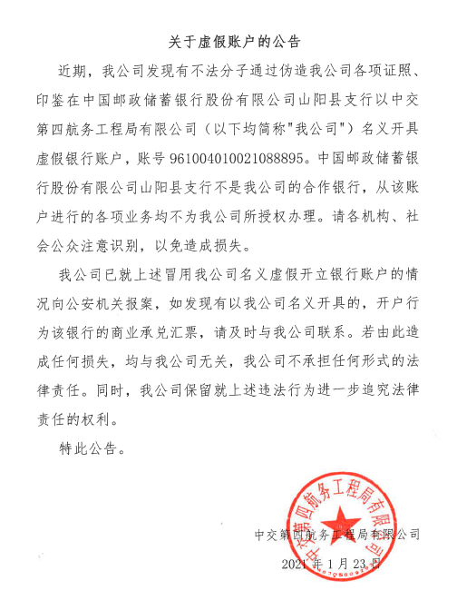 近期,我公司發(fā)現(xiàn)有不法分子通過偽造我公司各項(xiàng)證照、印鑒在中國郵政儲蓄銀行股份有限公司山陽縣支行以中交第四航務(wù)工程局有限公司(以下均簡稱"我公司")名義開具虛假銀行賬戶,賬號961004010021088895。中國郵政儲蓄銀行股份有限公司山陽縣支行不是我公司的合作銀行,從該賬戶進(jìn)行的各項(xiàng)業(yè)務(wù)均不為我公司所授權(quán)辦理。請各機(jī)構(gòu)、社會公眾注意識別,以免造成損失。