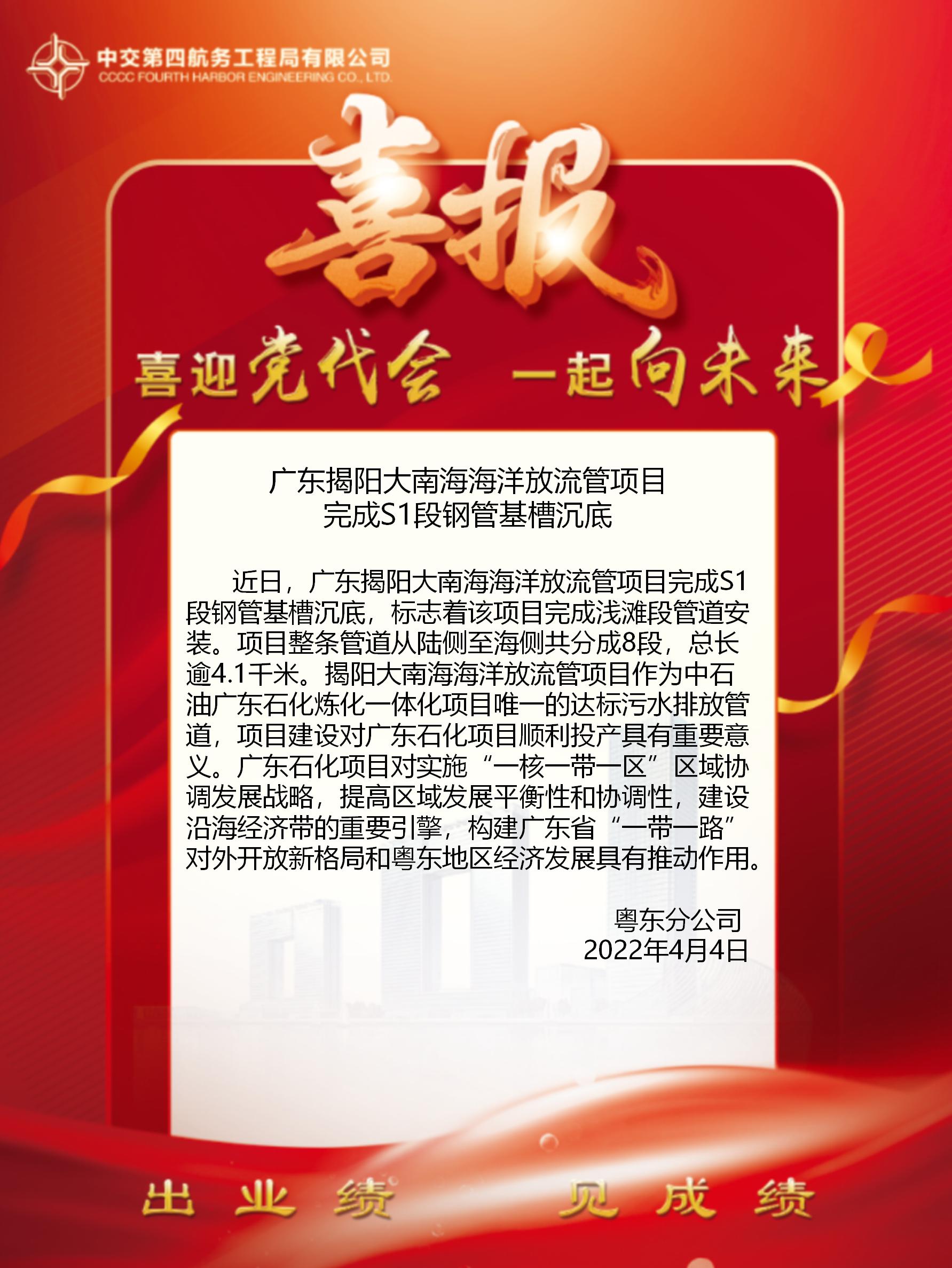 廣東揭陽大南海海洋放流管項(xiàng)目完成S1段鋼管基槽沉底