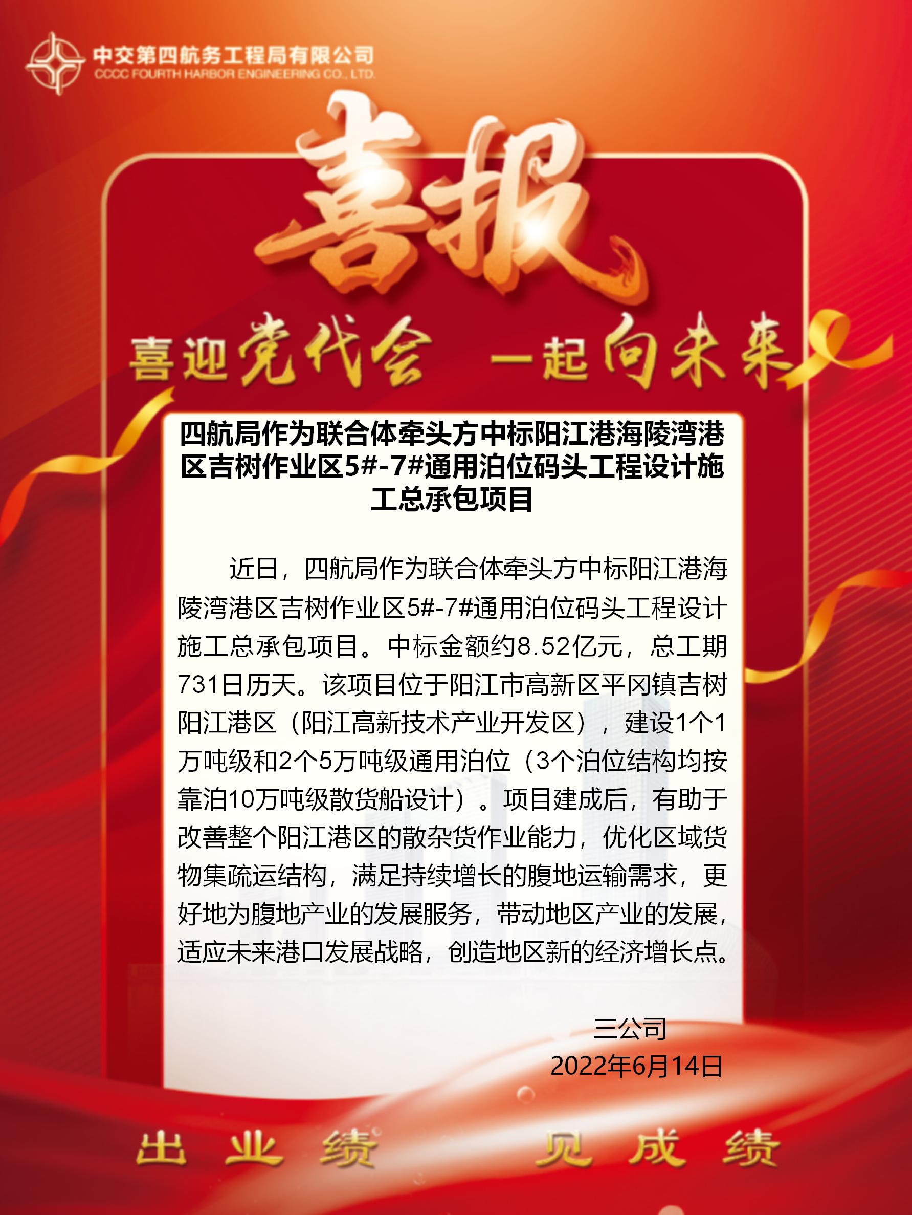四航局作為聯(lián)合體牽頭方中標(biāo)陽(yáng)江港海陵灣港區(qū)吉樹(shù)作業(yè)區(qū)5#-7#通用泊位碼頭工程設(shè)計(jì)施工總承包項(xiàng)目