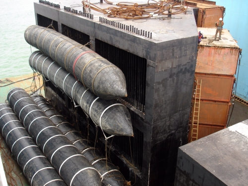 該取水頭重1074噸,長(zhǎng)18.8米,寬10.5米,高10.5米,頭部呈"喇叭"型,結(jié)構(gòu)不規(guī)則且體積大,安裝此類構(gòu)件的技術(shù)難度在國(guó)內(nèi)都比較罕見(jiàn)。11月底,北部灣處在東北風(fēng)季節(jié),給安裝工作帶來(lái)了很大困難。為了攻克技術(shù)難關(guān),承建此項(xiàng)工程的防城港電廠項(xiàng)目部,成立了以副經(jīng)理周春林為首的技術(shù)小組,對(duì)施工方案反復(fù)論證,采取氣囊和浮箱助浮及250噸起重船助吊的工藝進(jìn)行構(gòu)件安裝。23日中午"防城港"浮船塢開(kāi)始下潛,現(xiàn)場(chǎng)技術(shù)人員發(fā)揚(yáng)敢打敢拼的拼搏精神,經(jīng)過(guò)20個(gè)小時(shí)的連續(xù)奮戰(zhàn),于24日清晨安裝成功,為后續(xù)的3件取水頭安裝打下了基礎(chǔ)。 (劉 潔)