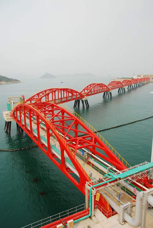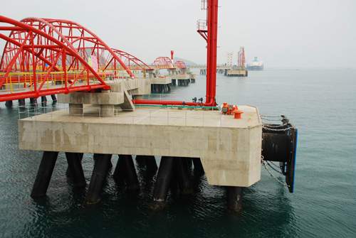 本工程為棧橋高樁墩臺開敞式碼頭,碼頭前沿離岸750米,泊位長490米,由1個工作平臺,2個靠船墩,6個系纜墩組成,工程是在原建15萬噸級碼頭的基礎(chǔ)上擴建為30萬噸的原油碼頭。