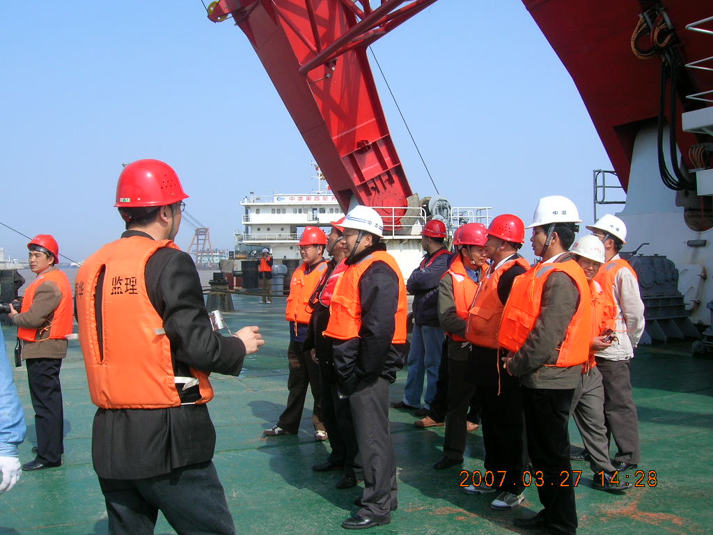 2007年3月27日下午,寧波金塘大橋項目工程指揮部由總指揮王助理和安監(jiān)處楊處長帶隊,組織所有參加金塘大橋建設(shè)的同仁單位團(tuán)隊到我局"四航奮進(jìn)"船上現(xiàn)場參觀學(xué)習(xí)。
