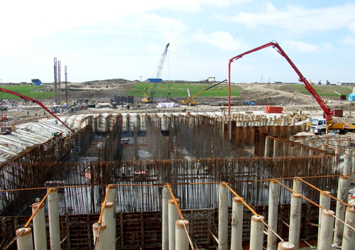 水泵房底板長(zhǎng)54米,寬26.8米,厚度2米,實(shí)際澆注混凝土方量2860立方米。為實(shí)現(xiàn)"水泵房底板澆筑"的節(jié)點(diǎn)目標(biāo),項(xiàng)目部全面動(dòng)員包括合作伙伴在內(nèi)的廣大施工人員掀起了勞動(dòng)競(jìng)賽趕工熱潮,通過(guò)合理調(diào)配內(nèi)部資源,優(yōu)化施工工藝,克服了20多天連續(xù)陰雨天氣帶來(lái)的不利因素,共完成560噸鋼筋綁扎和320 平方米大型模板安裝。整個(gè)澆筑期間,項(xiàng)目部各部門通力合作,恪盡職守,體現(xiàn)出項(xiàng)目部員工強(qiáng)大的凝聚力和戰(zhàn)斗力,確保了澆筑順利進(jìn)行,為船塢后續(xù)施工奠定基礎(chǔ)。