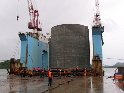 9月10、11日該工程進行了首個圓筒安裝的典型施工,在公司、分公司有關(guān)相關(guān)人員的現(xiàn)場指導下,項目部領(lǐng)導帶領(lǐng)施工人員在"防城港"號船組人員的通力配合,冒雨作業(yè),從9月10日中午12點圓筒上塢,到9月11日中午12點順利完成安裝。