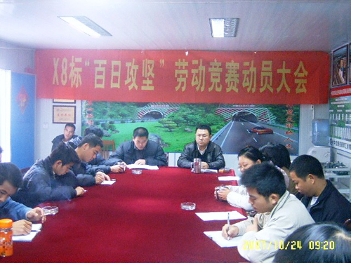 10月24上午,一公司湖北滬蓉西X8標(biāo)項(xiàng)目部召開以該公司的"兩創(chuàng)一保"、滬蓉西指揮部的"四比四保"為主題的"百日攻堅(jiān),確保年底隧道左洞安全順利貫通"勞動(dòng)競賽活動(dòng)誓師動(dòng)員大會。項(xiàng)目部各部門都簽訂了"百日攻堅(jiān)"勞動(dòng)競賽責(zé)任目標(biāo)書。