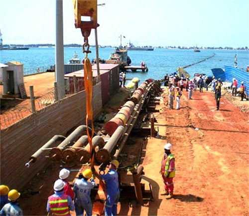 業(yè)主代表、咨工到施工現(xiàn)場(chǎng)對(duì)管線的成功下水表示熱烈祝賀。目前,該管道已順利拖至安裝地點(diǎn),正在進(jìn)行主碼頭與油碼頭之間的就位調(diào)整工作,下一步將進(jìn)行陸上豎向管線與水下管線連接部分的焊接,預(yù)計(jì)該部分焊接工作將在4天之內(nèi)完成。