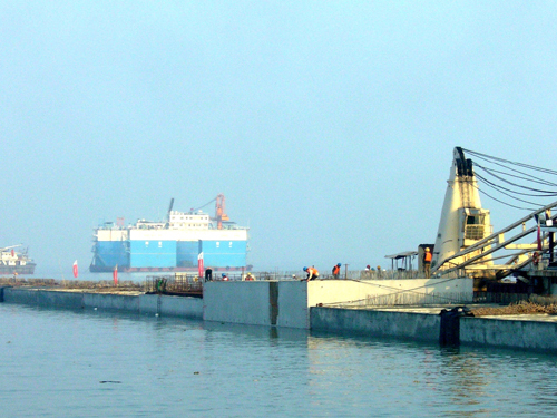 該工程于2007年7月13日正式開工,總工期321天,工程總造價1.1億元,碼頭岸線長640米。工程共需安裝沉箱32件,單件沉箱長19.95米×寬11.5米×高11.5米,重約1232,2007年8月29日開始安裝第一件沉箱。