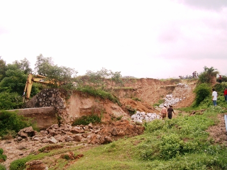 南倉(cāng)陂和開口石路于2005年被山洪沖毀后,由于沒有資金,三年來一直無法得到修建,靠南倉(cāng)陂取水灌溉的600多畝農(nóng)田也因此成了"望天田";開口石路由于崩塌,連手扶拖拉機(jī)都無法通行,使經(jīng)開口石路出行的7條自然村的出行和運(yùn)輸成了困難,村民在開口石路崩塌處打上幾根木樁,對(duì)付著行走,情景真是險(xiǎn)象環(huán)生。