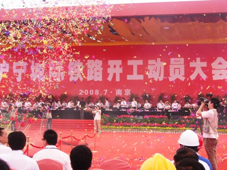 7月1日,滬寧城際鐵路開工動(dòng)員大會(huì)在南京仙林召開,標(biāo)志著備受矚目的滬寧城際鐵路正式開工建設(shè)。大會(huì)由江蘇省省長羅志軍主持,中共中央政治局委員、上海市委書記俞正聲宣布工程開工,鐵道部部長劉志軍、江蘇省委書記梁保華、上海市市長韓正分別發(fā)表講話。