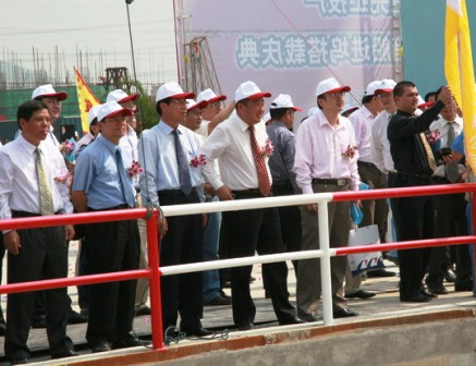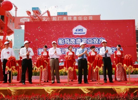10月9日,四航局承建的廣州文沖船廠1號(hào)、2號(hào)船塢技術(shù)改造工程1號(hào)船塢完工投產(chǎn),廣州文沖船廠有限責(zé)任公司在施工現(xiàn)場(chǎng)舉行了隆重的船塢完工投產(chǎn)暨2800TEU集裝箱進(jìn)塢搭載慶典儀式。中國(guó)船舶工業(yè)集團(tuán)公司總經(jīng)理助理余寶山、廣州文沖船廠有限責(zé)任公司董事長(zhǎng)殷學(xué)明;中交股份有限公司副總裁陳玉勝、四航局董事長(zhǎng)梁卓仁、二公司總經(jīng)理李惠明等領(lǐng)導(dǎo)出席了慶典儀式。