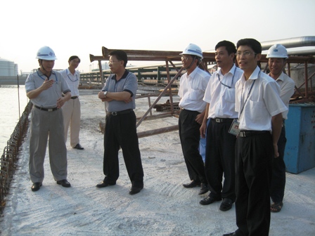 近日,湛江港董事長(zhǎng)鄭日強(qiáng)一行到湛江港寶滿集裝箱碼頭一期工程和湛江港股份有限公司新建油碼頭工程施工現(xiàn)場(chǎng)檢查指導(dǎo)工作,并聽(tīng)取了施工進(jìn)度、安全質(zhì)量以及防御臺(tái)風(fēng)"海高斯"的情況匯報(bào)。