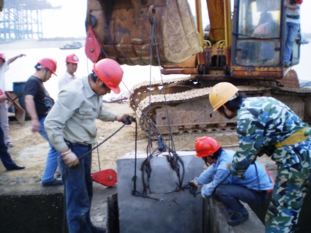 插板位于沉箱間的接縫處,單件長(zhǎng)19.2米、寬1米,重8.5噸。鑒于該分項(xiàng)造價(jià)小、成本控制難的特點(diǎn),嵩嶼項(xiàng)目部放棄了傳統(tǒng)配合安裝的工藝,將每件插板平分成6小段預(yù)制,同時(shí)自制兩個(gè)"鋼筋銷子"穿過鋼絲繩及插板吊環(huán),輕松解決了下水解扣的難題;在穿過插板的拉桿兩端分別用焊接的十字槽鋼做螺栓帽,保證了插板在安裝時(shí)能沿倒濾井壁緩緩滑落,有效地節(jié)約了施工時(shí)間及成本。