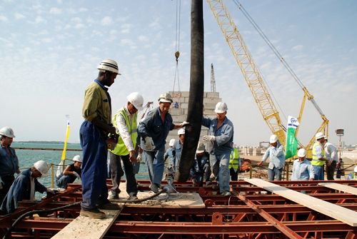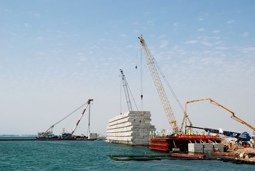 沙特RSGT碼頭工程共需澆筑胸墻71段,砼總量超過4萬立方米。由于胸墻底標(biāo)高低于潮位線,施工受潮水影響很大,為確保水下混凝土澆筑質(zhì)量,胸墻澆筑前,項目部制定質(zhì)量保證措施,進行了現(xiàn)場試驗并經(jīng)咨工認可。胸墻澆筑時,各職能部門安排人員輪流值班,經(jīng)過7個小時的連續(xù)施工,第一段胸墻澆筑勝利完成。