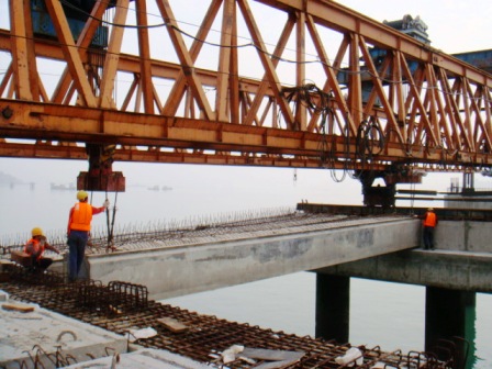 該工程共架設(shè)梁、板505件,構(gòu)件最長25.36米,最重59噸。采用一臺30m/80t架橋機(jī),配備一套軌道運(yùn)梁系統(tǒng)進(jìn)行架設(shè)。