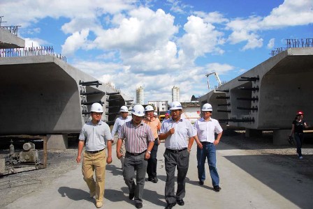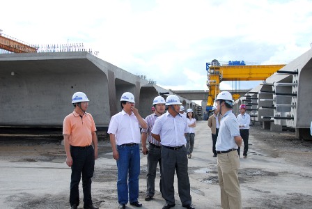 朱碧新一行沿線視察了曲家屯特大橋線下、架梁施工現(xiàn)場(chǎng),并驅(qū)車(chē)到19號(hào)梁場(chǎng)仔細(xì)察看了制梁過(guò)程和成品梁。視察時(shí),朱碧新聽(tīng)取了哈大項(xiàng)目領(lǐng)導(dǎo)的工作匯報(bào),詳細(xì)詢問(wèn)了哈大架子隊(duì)的勞務(wù)管理模式,充分肯定了四航局哈大項(xiàng)目的工程進(jìn)展情況。他指出,哈大團(tuán)隊(duì)不遠(yuǎn)千里趕到東北建設(shè)鐵路,項(xiàng)目部由一開(kāi)始的不適應(yīng)到現(xiàn)在已經(jīng)完全克服了東北的嚴(yán)寒天氣,適應(yīng)了高速鐵路的施工氛圍,在生產(chǎn)建設(shè)上不斷加大落實(shí)力度,在進(jìn)度上能夠后來(lái)居上,為中交集團(tuán)的大鐵路戰(zhàn)略做出了突出貢獻(xiàn),他代表集團(tuán)領(lǐng)導(dǎo)對(duì)一線戰(zhàn)士的辛勤付出表示衷心的感謝。