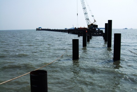 同時,檳城二橋主橋項目大陸側棧橋碼頭施工進展順利。大陸側棧橋總長度783米,碼頭長88米,寬21米,共計5782平方米,主要由基礎鋼管樁振打、型鋼架設、橋面鋪裝三部分組成。截至7月12日,大陸側棧橋碼頭255條鋼管樁施工全部完成,并完成橋面鋪設3388平方米。目前,項目部正向大橋主體工程發(fā)起沖鋒。