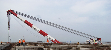 寶滿集裝箱碼頭構件共1454件,其中前后軌道梁共140件,后軌道梁單根重達70噸,跨距39米,安裝準確率及安全性要求高,安裝難度大。為此,項目部積極找尋合作單位及船機資源,嚴格控制成本,對聯(lián)合起吊工藝、杠桿起吊工藝、船機改造等方案進行反復論證與測試,最終確定由"粵惠州工9628"實施安裝。