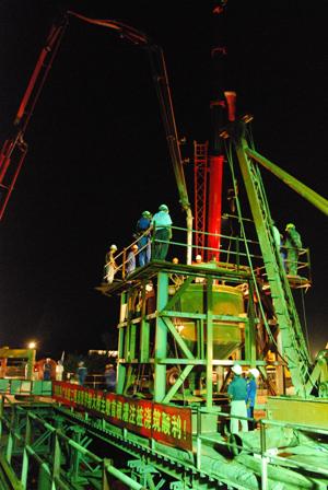 思賢窖特大橋是貴廣全線控制性工程之一,大橋主墩基礎(chǔ)由18根直徑3.0米灌注樁組成。四航局貴廣指揮部高度重視首根樁的澆筑施工,為了確保首樁的成功澆注,承建的一項(xiàng)目經(jīng)理部精心策劃,細(xì)心組織,從典型施工的策劃到澆筑時(shí)間的選擇、人員機(jī)械的調(diào)配,澆筑現(xiàn)場(chǎng)的有效指揮以及突發(fā)事件的應(yīng)急措施等方面給予了充分準(zhǔn)備。四航局指揮部常務(wù)副指揮長(zhǎng)盧玉榮,高級(jí)顧問(wèn)張恩持、劉文華,三公司黨委書(shū)記陳浩平、總工程師馮國(guó)耀等于深夜一并親臨現(xiàn)場(chǎng)策劃、指導(dǎo)、組織首樁砼澆注的施工。