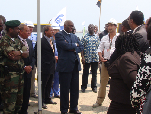 9月10日,安哥拉總統(tǒng)多斯桑托斯一行先后到四航局洛比托碼頭修復(fù)及擴(kuò)建工程和洛比托道堆旱碼頭工程視察指導(dǎo)。
