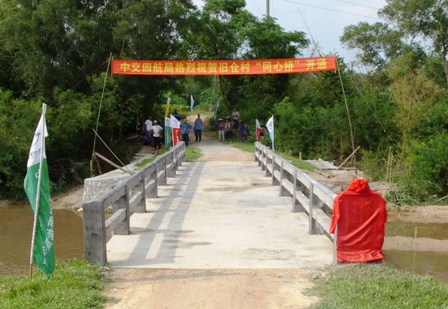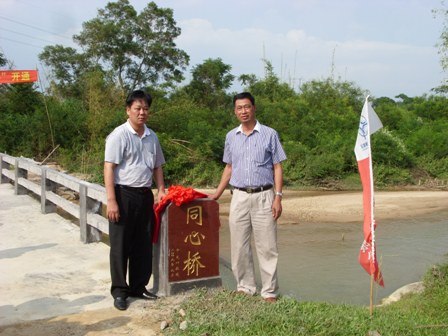 9月18日,由四航局捐款修建的舊倉村委會(huì)古朗村"同心橋"開通儀式隆重舉行,四航局黨委副書記阮祥發(fā)和新墟鎮(zhèn)委書記陳偉生共同為"同心橋"揭牌。