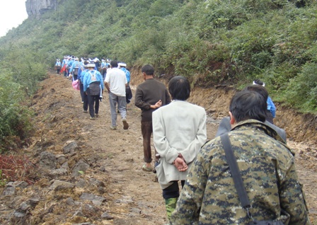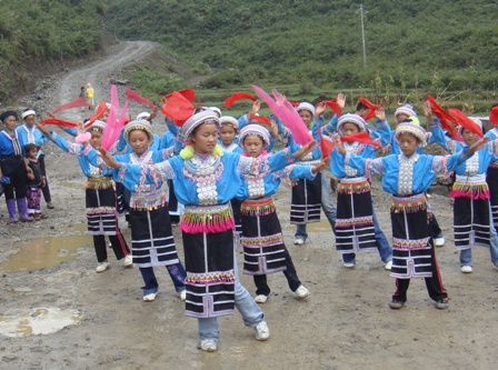 項(xiàng)目部一工區(qū)駐地毗鄰光坡村泡木坪寨,該寨與一工區(qū)進(jìn)場施工便道直線距離約4公里,居住著幾百名苗族村民。由于泡木坪寨被大山環(huán)繞,沒有道路通往外界,村里小孩上下學(xué)及村民進(jìn)出山極為不便,尤其是遇到雨季更是舉步維艱。項(xiàng)目部的人員看在眼里,急在心里,主動提出義務(wù)為村民修路,歷時半個月完成了一條寬4米,長5.5公里的山區(qū)鄉(xiāng)村道路。木坪寨村民為感謝四航局,于工區(qū)進(jìn)場便道上樹立"感謝信"宣傳牌,并邀請施工人員到寨里做客。并有40多名村民身著民族服裝,冒著細(xì)雨,自發(fā)性地來到一工區(qū)駐地,為施工人員跳起了民族舞蹈,對施工人員近半個月的艱苦努力表示感謝。