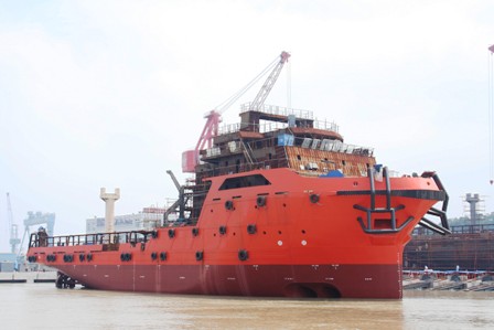 4月30日,一艘78米海洋平臺維護船在新會生產(chǎn)基地順利下水,這是航通公司為馬來西亞船東建造的第三艘78米多用途船。