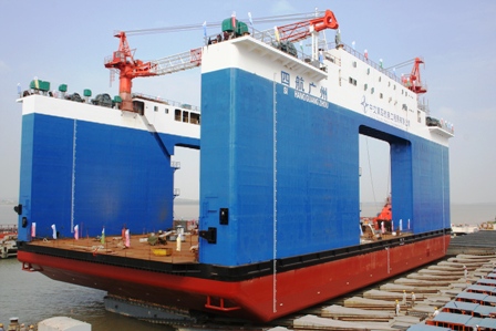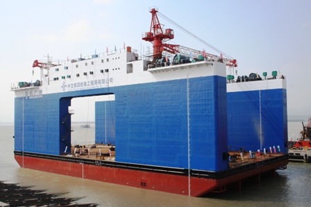 "四航廣州"號半潛駁長78米,寬40米,高31米,型深6.20米,設計舉升能力8000T,最大下潛深度24.20米。該半潛駁是四航局繼建造"四航奮進"號(2600噸起重船)、"粵工樁8"(93米樁架打樁船)、"粵工拖68"(7000匹馬力拖輪)等我國一流工程船舶之后,建造的又一艘大型工程船舶,預計于11月底交付使用,屆時將進一步提高四航局施工裝備水平,提升四航局在國內(nèi)外港口工程建設市場的綜合競爭力。