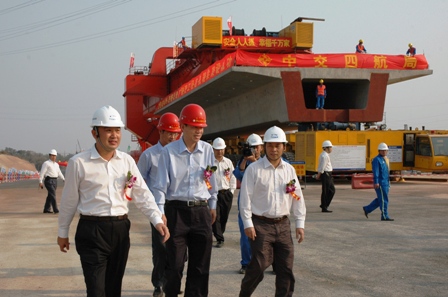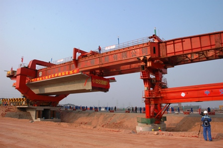 設(shè)計(jì)時速200公里的貴廣鐵路是國家和鐵道部重大投資項(xiàng)目之一,四航局承建貴陽至廣州鐵路站前工程GGTJ-13標(biāo)段,全長38.67公里,共需預(yù)制架設(shè)452孔箱梁。每片箱梁長32.6米、寬12.2米、高3.09米、重760噸,四航局貴廣二項(xiàng)目部采用1臺900噸運(yùn)梁車和1臺900噸架橋機(jī)配合進(jìn)行運(yùn)梁和架設(shè)。現(xiàn)場人員嚴(yán)格按照預(yù)先制定的方案和操作規(guī)程,環(huán)環(huán)相扣、精心操作,確保了箱梁架設(shè)既安全順利,又精確到位。