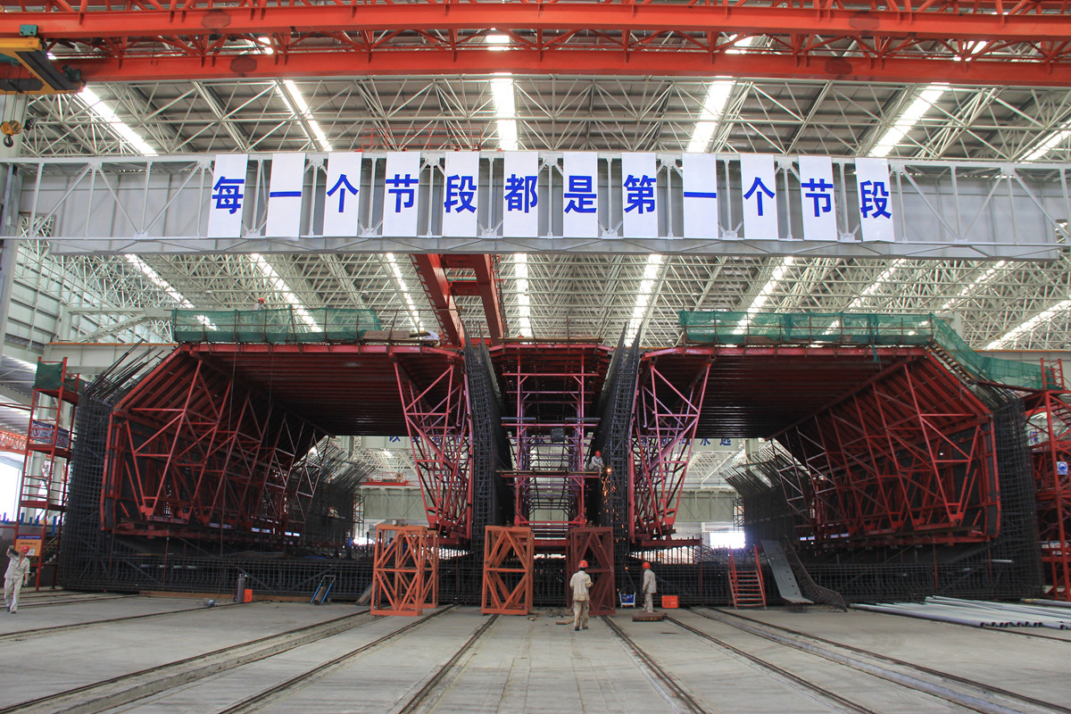 沉管隧道大型管節(jié)工廠法流水線施工屬國(guó)內(nèi)首例,該項(xiàng)目在沉管鋼筋流水線施工技術(shù)、全斷面液壓模板系統(tǒng)一次成型沉管施工技術(shù)、大管節(jié)混凝土構(gòu)件防裂技術(shù)、三點(diǎn)支撐液壓頂推技術(shù)等方面均有重大創(chuàng)新,研究成果中多項(xiàng)新材料、新技術(shù)、新工藝、新設(shè)備填補(bǔ)了國(guó)內(nèi)技術(shù)空白,成果達(dá)到國(guó)際領(lǐng)先水平。