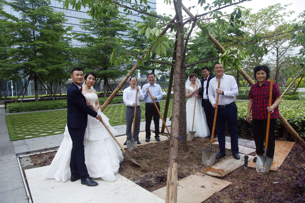 集體婚禮活動(dòng)期間,梁卓仁、李惠明、楊志超和曹淑珍與新人代表在廣州之窗總部大廈江邊綠化帶參加了植樹活動(dòng),以此傳播環(huán)保理念,祈愿新人愛情天長地久。
