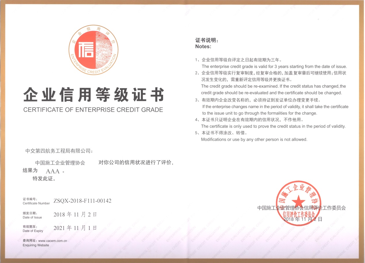 信用等級(jí)證書是市場(chǎng)經(jīng)營、評(píng)優(yōu)選優(yōu)等活動(dòng)的重要依據(jù),AAA級(jí)為施工企業(yè)信用評(píng)級(jí)三級(jí)五等中的最高級(jí)別。獲評(píng)中國施工企業(yè)管理協(xié)會(huì)AAA級(jí)信用企業(yè),充分肯定了四航局誠信經(jīng)營、創(chuàng)新發(fā)展的綜合實(shí)力,為企業(yè)持續(xù)健康發(fā)展打下了堅(jiān)實(shí)的基礎(chǔ)。