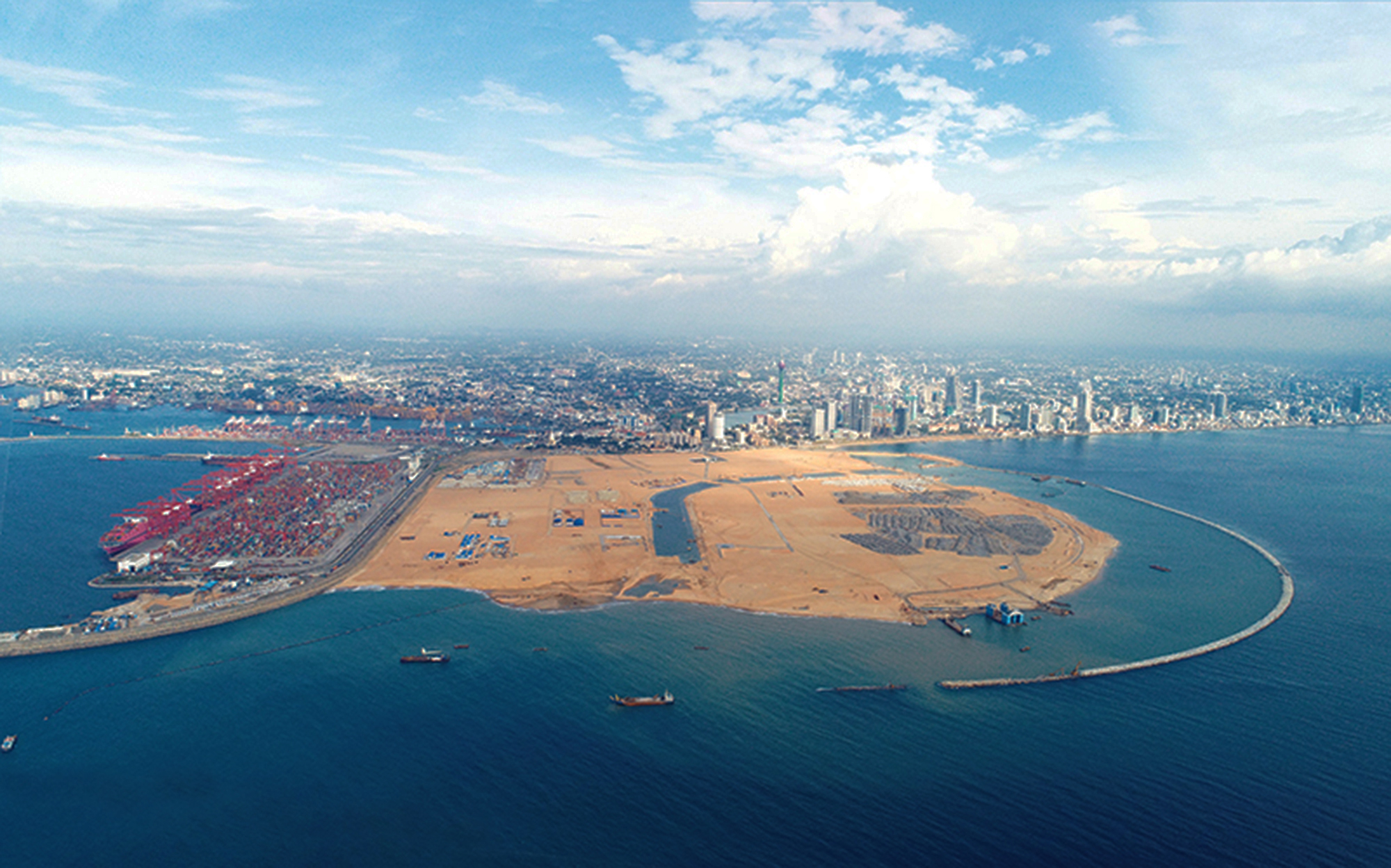 科倫坡港口城項(xiàng)目施工內(nèi)容主要包括3245米主防波堤、5599米內(nèi)河景觀護(hù)岸、920米游艇碼頭護(hù)岸以及沙灘擋墻護(hù)岸、南攔砂壩、北攔砂壩、內(nèi)防波堤、潛堤等相關(guān)附屬設(shè)施。