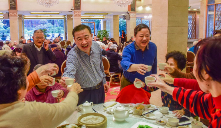 在喜慶歡快的氣氛中,梁卓仁、張猛來(lái)到老同志身邊,向老同志舉杯問(wèn)候,共祝新春。
