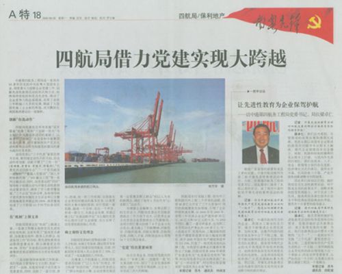中港第四航務(wù)工程局是一家具有50多年歷史的中央駐粵大型國有企業(yè)。改革開放以來,尤其是近三年以來,中港四航局黨委高舉鄧小平理論和"三個代表"重要思想偉大旗幟,認(rèn)真貫徹黨的十六大和十六屆三中、四中、五中全會精神,全面落實科學(xué)發(fā)展觀,緊緊抓住創(chuàng)新這個靈魂,大力創(chuàng)新企業(yè)黨建工作,深入開展"四好"班子創(chuàng)建活動,有力地加強(qiáng)和改進(jìn)了企業(yè)黨組織建設(shè),推動了企業(yè)競爭力的全面提高,實現(xiàn)了連續(xù)三年跨越三大步的發(fā)展,鑄就了大型國有施工企業(yè)新的輝煌,成為飄揚(yáng)在南國港灣建設(shè)的一面旗幟。