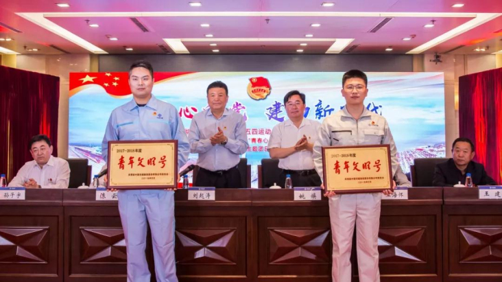 劉起濤與姚煥一同為獲得“中國青年五四獎?wù)录w”榮譽(yù)的四航局港珠澳大橋島隧工程項(xiàng)目部等集體頒發(fā)了“中國交建青年文明號”榮譽(yù)。