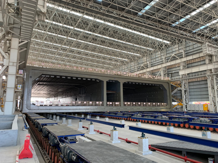 此次移運(yùn)的E1管節(jié),長(zhǎng)123.5米,寬46米,高10.6米,鋼殼重達(dá)8716噸,澆筑后重約6萬(wàn)噸。移運(yùn)時(shí),200臺(tái)臺(tái)車編隊(duì)從澆筑區(qū)進(jìn)車至鋼殼底部,利用152臺(tái)臺(tái)車支撐E1管節(jié)鋼殼,經(jīng)過(guò)支撐體系轉(zhuǎn)換,將鋼殼由無(wú)源支撐轉(zhuǎn)換至臺(tái)車液壓千斤頂受力后將E1管節(jié)鋼殼從卸泊區(qū)移運(yùn)至澆筑區(qū)指定位置。