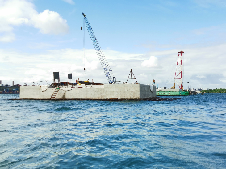 蒙巴薩港新建KOT項(xiàng)目是四航局集設(shè)計(jì)、采購、施工及試運(yùn)行于一體的大型EPC油碼頭項(xiàng)目,涵蓋疏浚、碼頭主體結(jié)構(gòu)及附屬設(shè)施建設(shè)、海底油管鋪設(shè)、機(jī)電安裝及陸上土建等工序。項(xiàng)目主碼頭為高樁離岸墩臺(tái)式結(jié)構(gòu),主碼頭工程泊位劃分為4個(gè)泊位,采用前后布置的形式,碼頭總長共計(jì)770米。其中一、三號泊位包括兩個(gè)靠船墩和一個(gè)裝卸平臺(tái)以及六個(gè)系纜墩,考慮到墩臺(tái)體積較大和海上運(yùn)距較遠(yuǎn)的問題,項(xiàng)目采用分層分塊澆筑的方式施工,前后澆筑40余次。一、三號泊位主體工程的完成,為后續(xù)二、四號泊位施工提供了工作面。